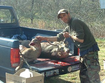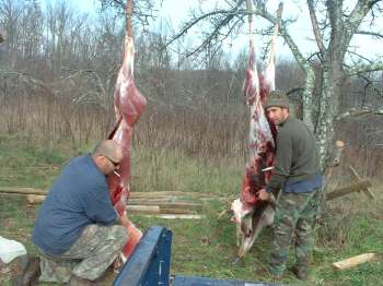 Here's a final shot of us skining them out. It was my first, and I must say, I did a fine job! Not one tear in the hide. I might tan him up, but I'm afraid that's more of a process than I might want to undertake!